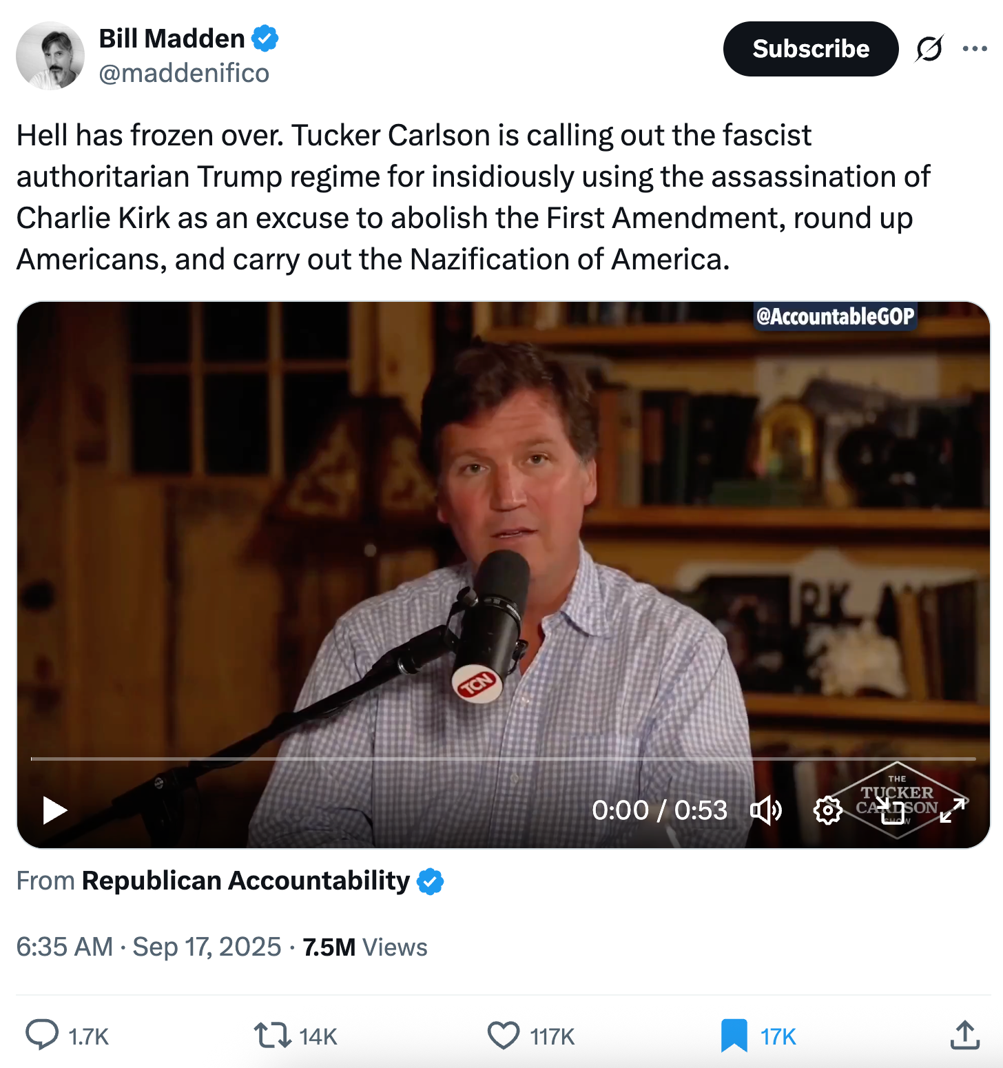 There's probably also the fear that he'll be caught up in the purge of media figures who haven't properly bent the knee. Carlson has no problem with fascism, so long as he can feel safe that the boot's not going to be on his neck. Now that he's not on Fox, that safety really isn't there.